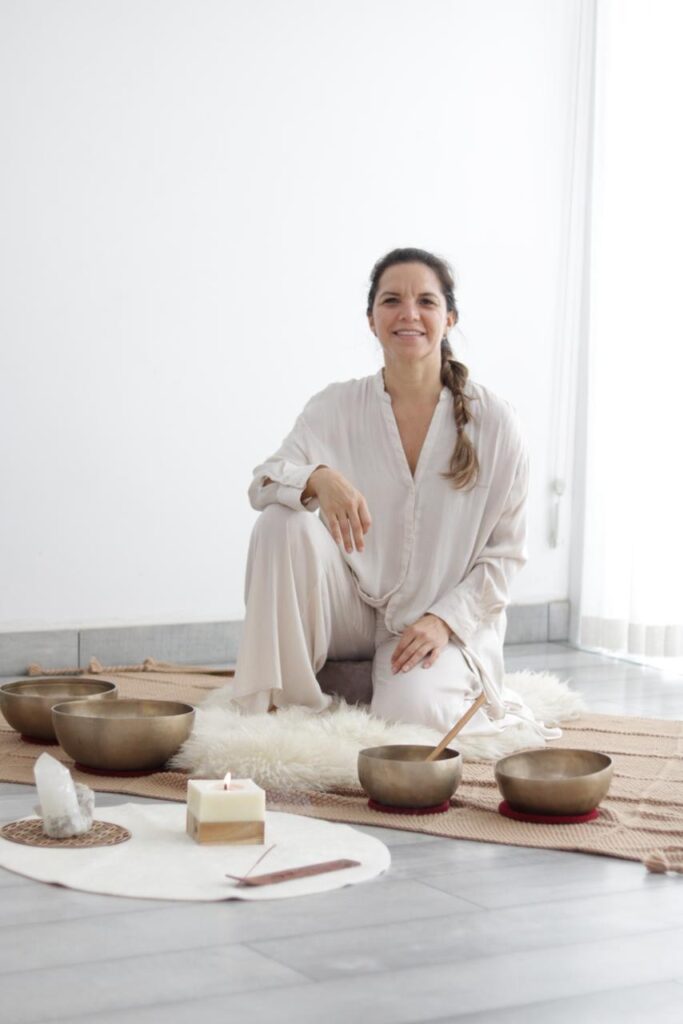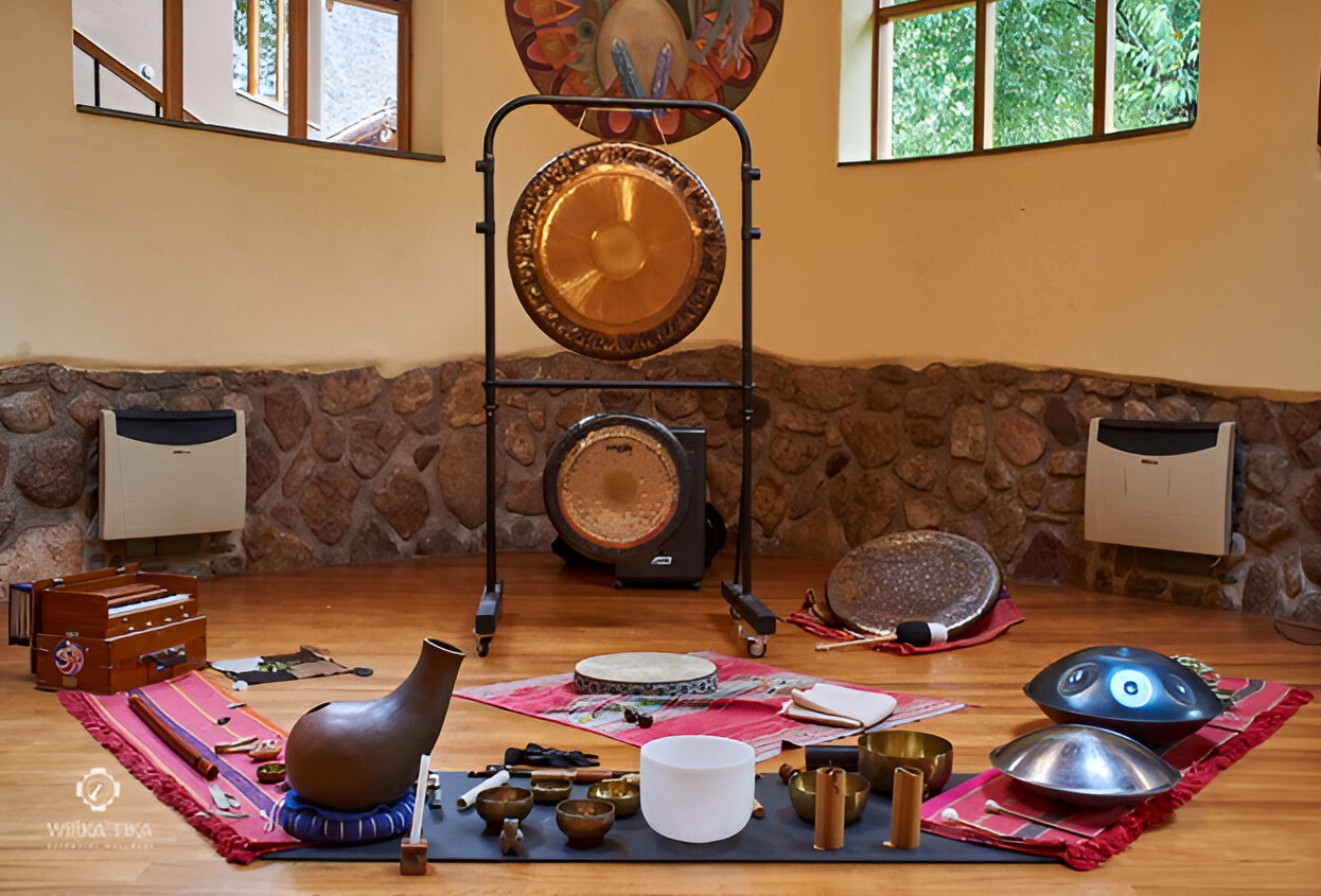 A meditative experience with crystal bowls and ancestral instruments, supporting chakra alignment and deep energetic healing in a beautiful setting.